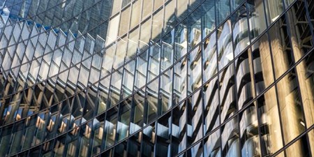 Reflection of clouds on a modern glass building, showcasing a blue sky with white and gray clouds in geometric window panels.